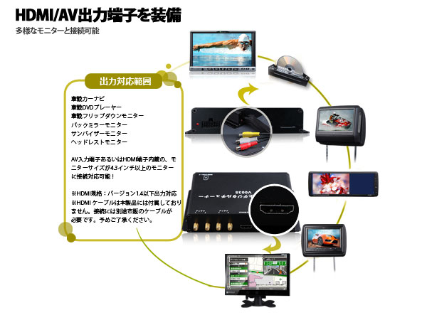 製品機能 商品名:ISDB-T 日本 地上デジタル ハイビジョンテレビチューナー 製品機能一覧 - 受信テレビジョン信号:ISDB-T フルセグ/ワンセグ - 受信テレビジョン信号周波数範囲:170〜770MHz(UHF) - アンテナ4x4受信技術 - 受信可能最高速度:150km/h - ハイビジョン(高精細度)デジタルテレビジョン信号受信感度:95db - 標準テレビジョン信号受信感度:85dbm - EPG(電子番組ガイド) 情報対応 - HDMI (バージョン1.4以下)出力対応 - CVBSビデオ信号出力対応(PAL/NTSC選択可) - 自動/手動スキャン可能 - 字幕表示対応 - メニュー言語:日本語/英語 - USB/SDアップデート対応 - 電源記憶機能 - アンテナ端子:SMA - 電源入力:DC 9V~DC 13.8V - AV出力端子×1 - RCA映像出力 1系統 - RCA音声R&L出力 1系統 - 外形寸法:155 x 85 x 32mm - 総重量:0.9KG 付属品: - リモコン(電池なし) 1個 - 日本語説明書 1部 - 赤外線(IR)受信ケーブル 1本 - アンテナ 4本 - 電源AVケーブル 1本 - ミニ B-CAS カード 1枚