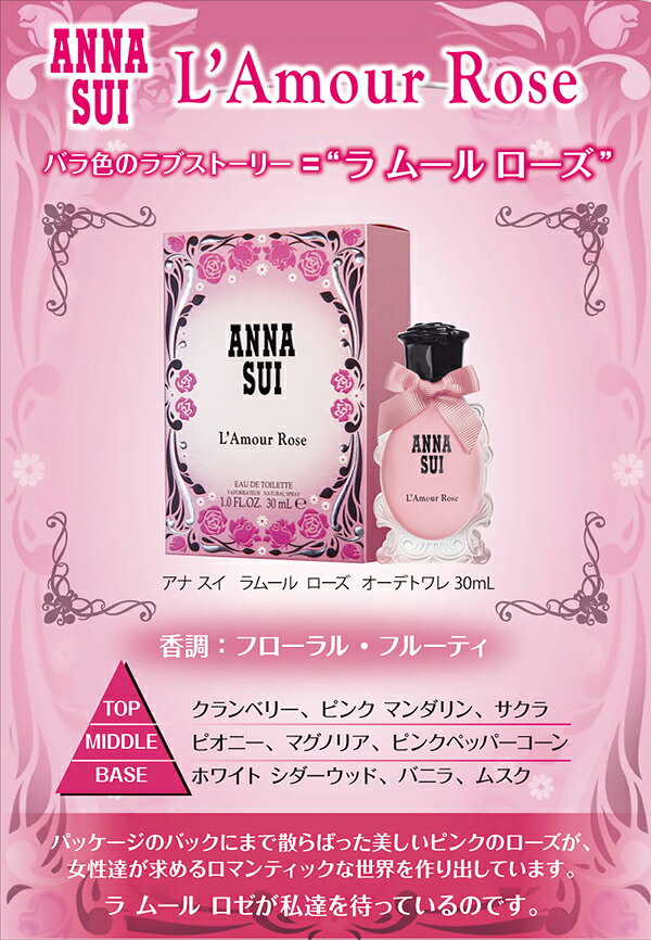 ◆ブランド:ANNA SUI(アナスイ) ◆商品名:ラムール ローズ ◆対象:レディース ◆容量:30ml ◆タイプ:EDT/SP(オードトワレ/スプレータイプ) ◆香調:フローラルフルーティ ◆商品説明: バラ色のラブストーリー。