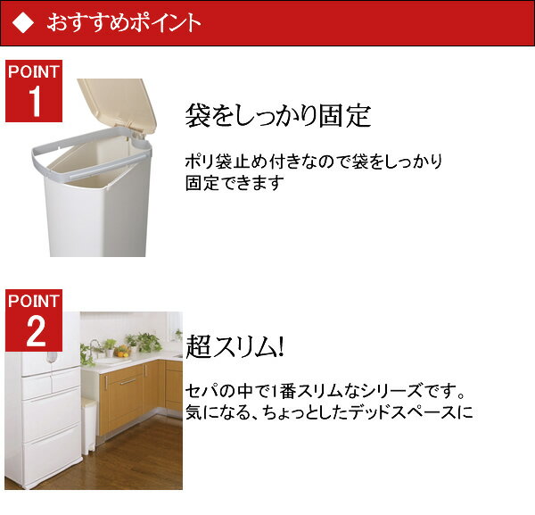 清潔・安心なゴミ箱 ・ 超スリム! セパの中で1番スリムなシリーズです 気になる、ちょっとしたデッドスペースに ・ 袋をしっかり固定 ポリ袋止め付きなので袋をしっかり 固定できます ・ 丸洗い可 汚れたときは丸洗いできますので 衛生的にお使いいただけます ・ 手を汚さない ペダル式なので手を汚さずに フタの開閉ができます サイズ(約mm) 幅220×奥行380×高さ545 素材 本体:ポリプロピレン連結棒:スチールペダル:ポリスチレン 容量(約) 26L カラー ホワイト ※北海道 沖縄 離島は別途送料かかります <検索> (ゴミ箱 ごみ箱 ごみばこ ダストボックス おしゃれ ふた付き 屋外 キッチン デザイン かわいい シンプル)