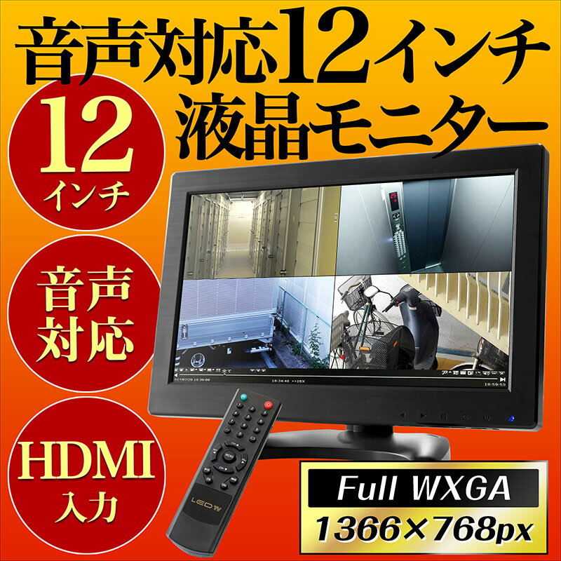 12インチ ワイド液晶 液晶モニター HDMI入力 FULLWXGA画質 スピーカー内蔵 音声対応 カラー モニター TFT LCD VGA BNC RCA USB 4系統入力 専用リモコン オンダッシュ 卓上 車載 【送料無料】
