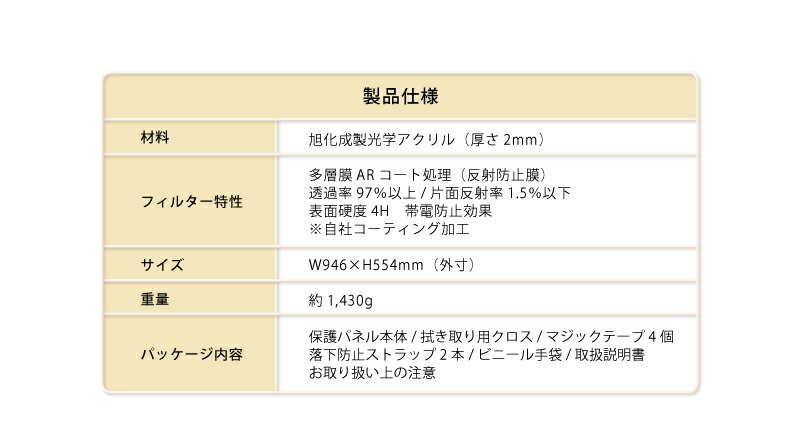 (lequaguard_anual.pdf/339kb) 製品仕様 材料 旭化成製光学アクリル(厚さ 2 mm) フィルター特性 多層膜ARコート処理(反射防止膜) 透過率97%以上/片面反射率1.5%以下 表面硬度 4H 帯電防止効果 ※自社コーティング加工 サイズ W946 X H554 mm (外寸) 重量 約1,430 g パッケージ内容 保護パネル本体、拭き取り用クロス、マジックテープ4個、落下防止ストラップ2本、ビニール手袋、取扱説明書(お取扱いの注意)